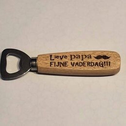 Houten flessenopener met leuke tekst gegraveerd.